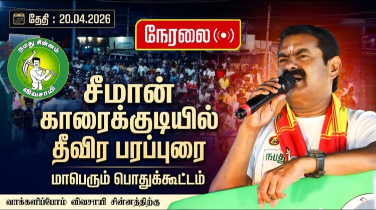 Contact us to Add Your Business காரைக்குடி சட்டமன்ற தேர்தல் 2026 சித்திரை 07 | 20-04-2026 | திங்கள் கிழமை தலைமை ஒருங்கிணைப்பாளர் சீமான் அவர்களின் பரப்புரை பயணத்திட்டம்