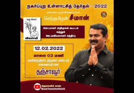 Contact us to Add Your Business தமிழகத்தில் வருகின்ற பிப்ரவரி 19 அன்று, ஒரே கட்டமாக நடைபெறவிருக்கும் நகர்ப்புற உள்ளாட்சித் தேர்தலில் “விவசாயி” சின்னத்தில் போட்டியிடுகின்ற நாம் தமிழர் கட்சி